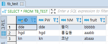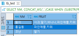FRUIT 컬럼을 보면 뚱이는 bbbbb, 홍길동은 aaabb, 코난은 abaaa 데이터가 들어가 있다.